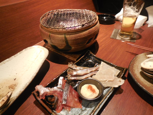 鮭、ししゃも、エイヒレの乾物を、セルフの炭で炙って食べました〜!