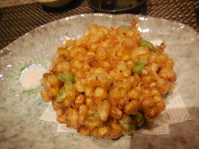 これ、とうもろこしと枝豆の天ぷらなんですよ。